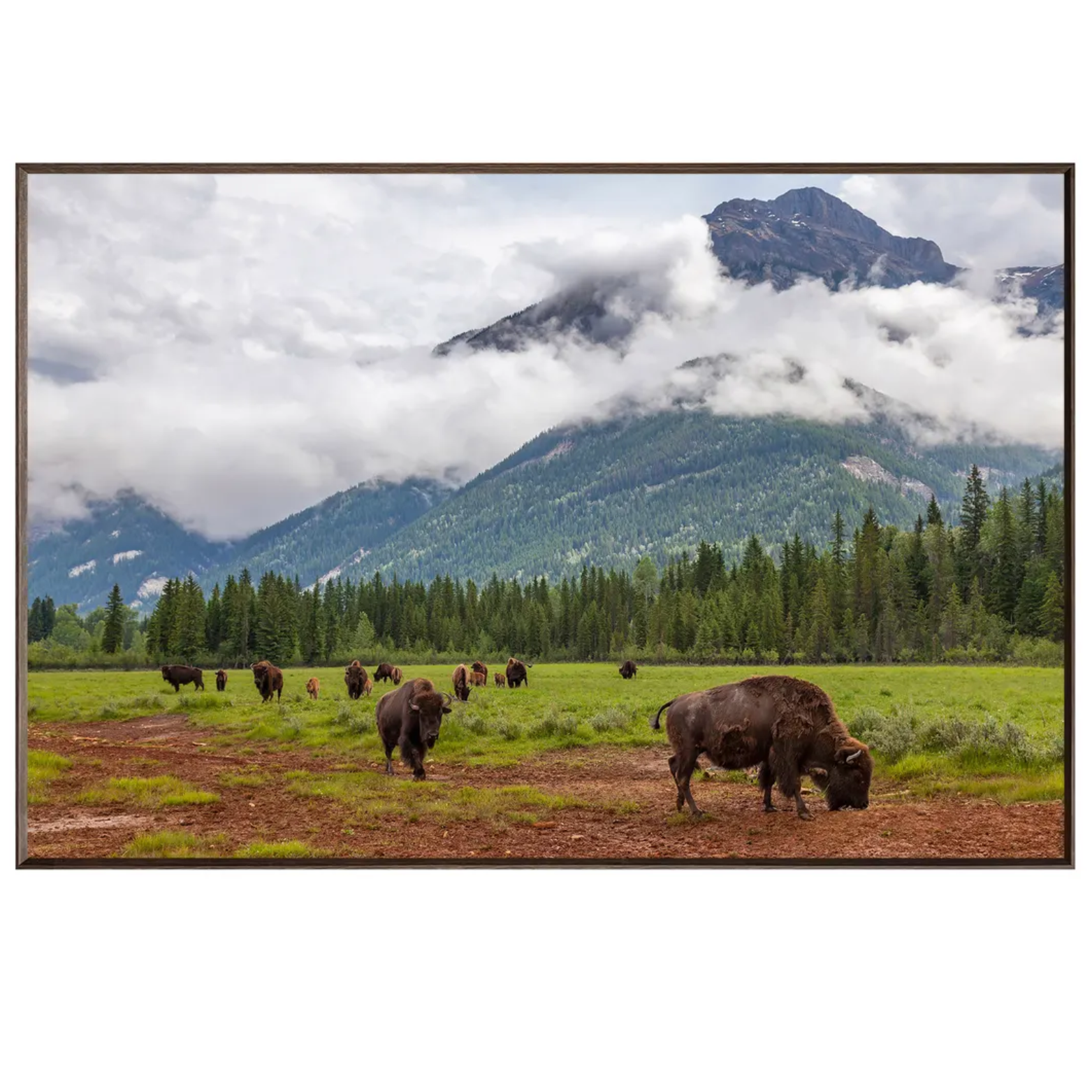 Capture the untamed spirit of the American frontier with the Bison Valley wall art by Crestview Collection. This captivating photographic masterpiece transports viewers to a serene, open field where a herd of wild American bison graze peacefully, embodying strength, resilience, and the raw beauty of nature. The scene is set against a backdrop of towering mature trees and a majestic mountain range, evoking a sense of nostalgia for the untouched landscapes of the past. The piece is displayed under clear tempered glass and surrounded by a rugged brown wooden frame, making it a perfect addition to lodge-style homes, mountain retreats, or any space inspired by the beauty of the great outdoors.