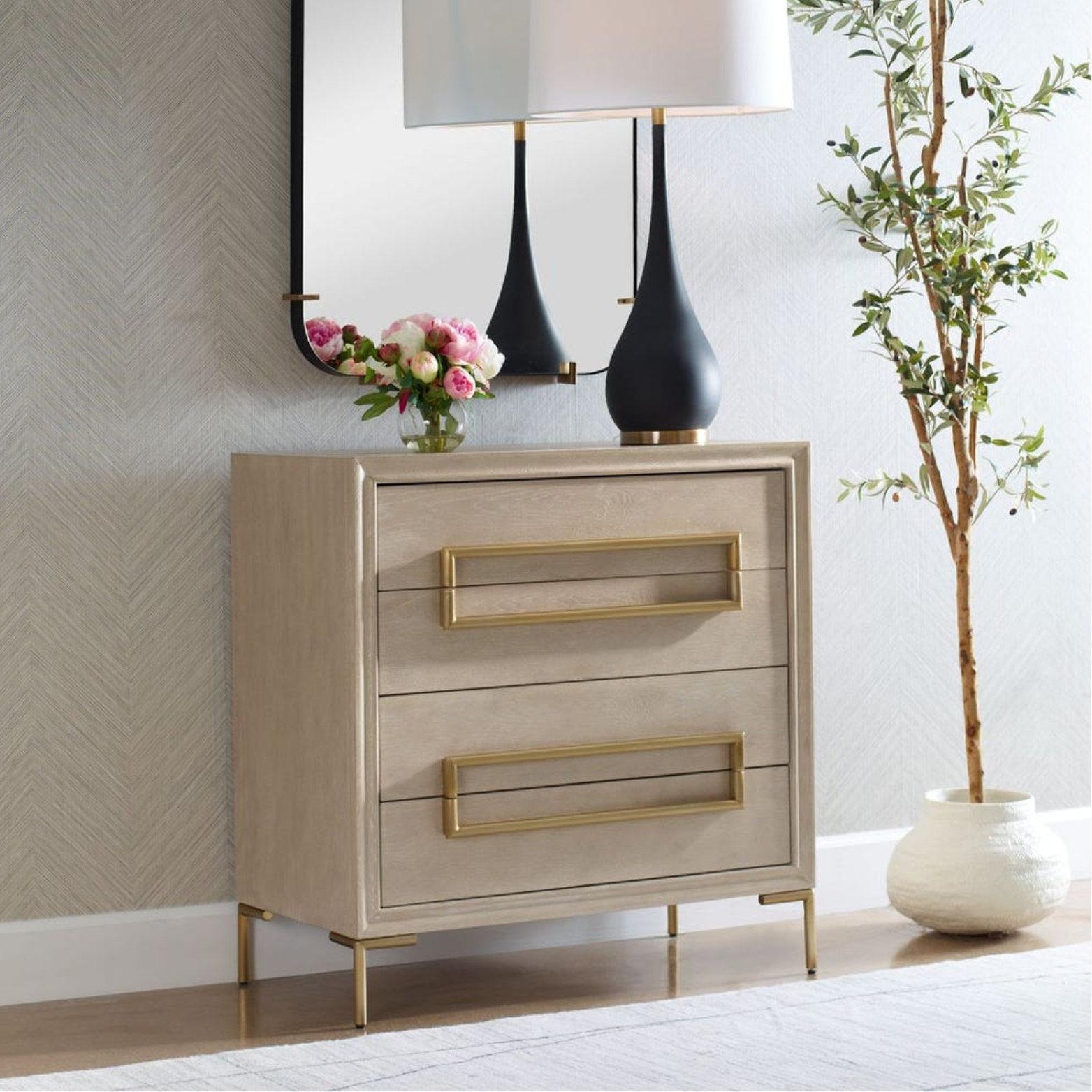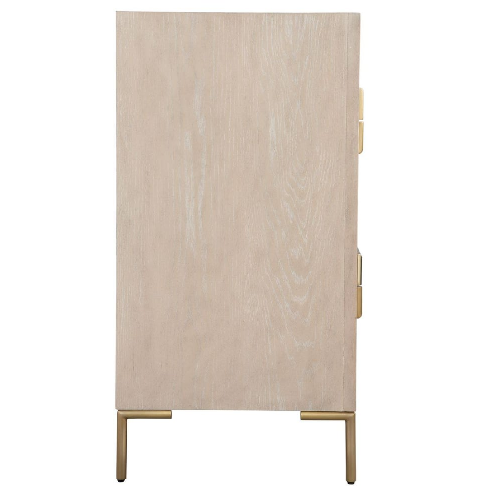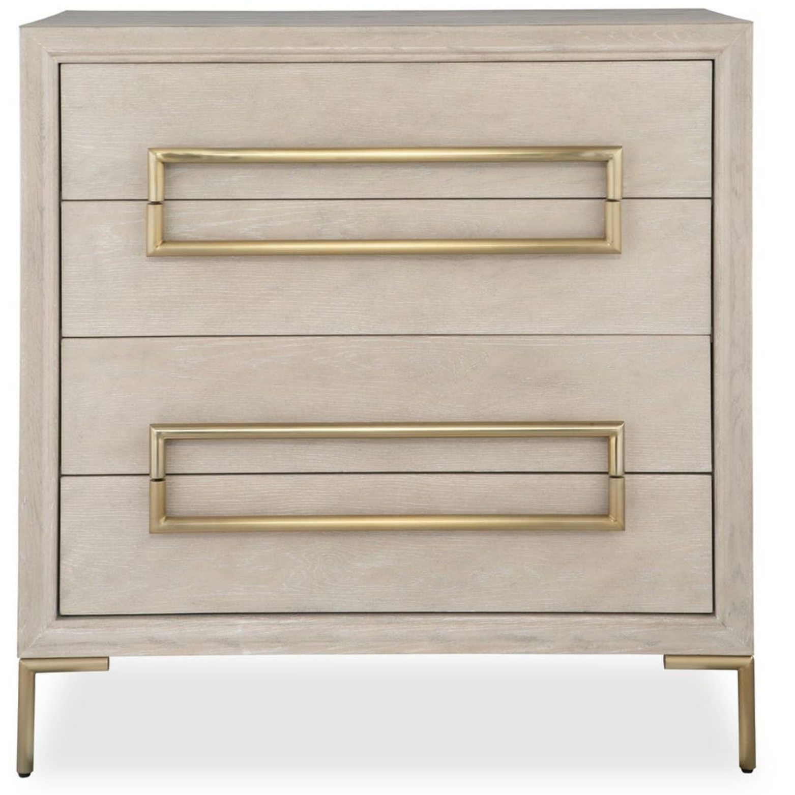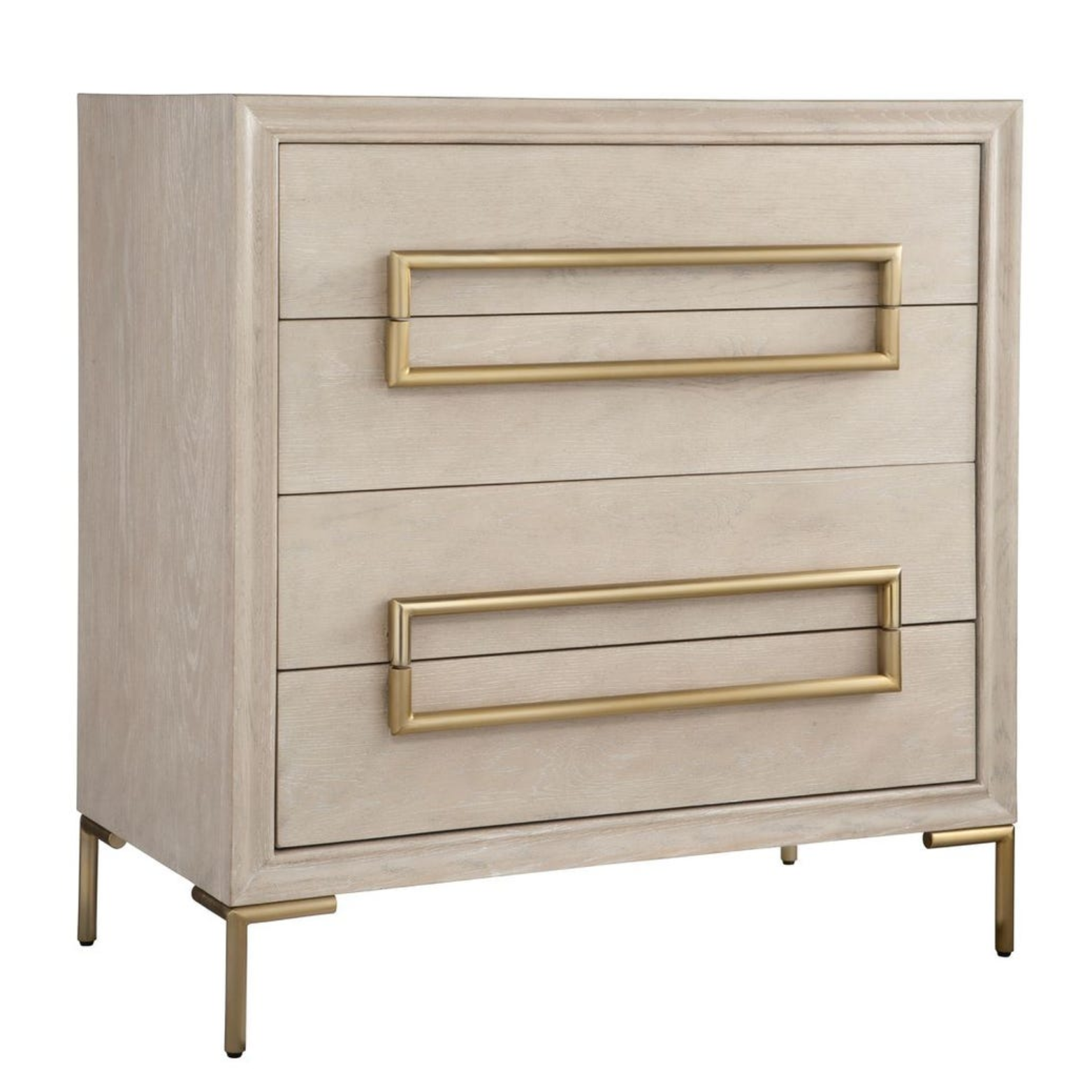 Showcasing a fresh contemporary look, the Alessia accent chest exhibits a light oak veneer and solids adding a touch of brightness to any room. Its stylish appeal is elevated with brushed brass plated stainless steel hardware and legs, with four soft closing drawers.