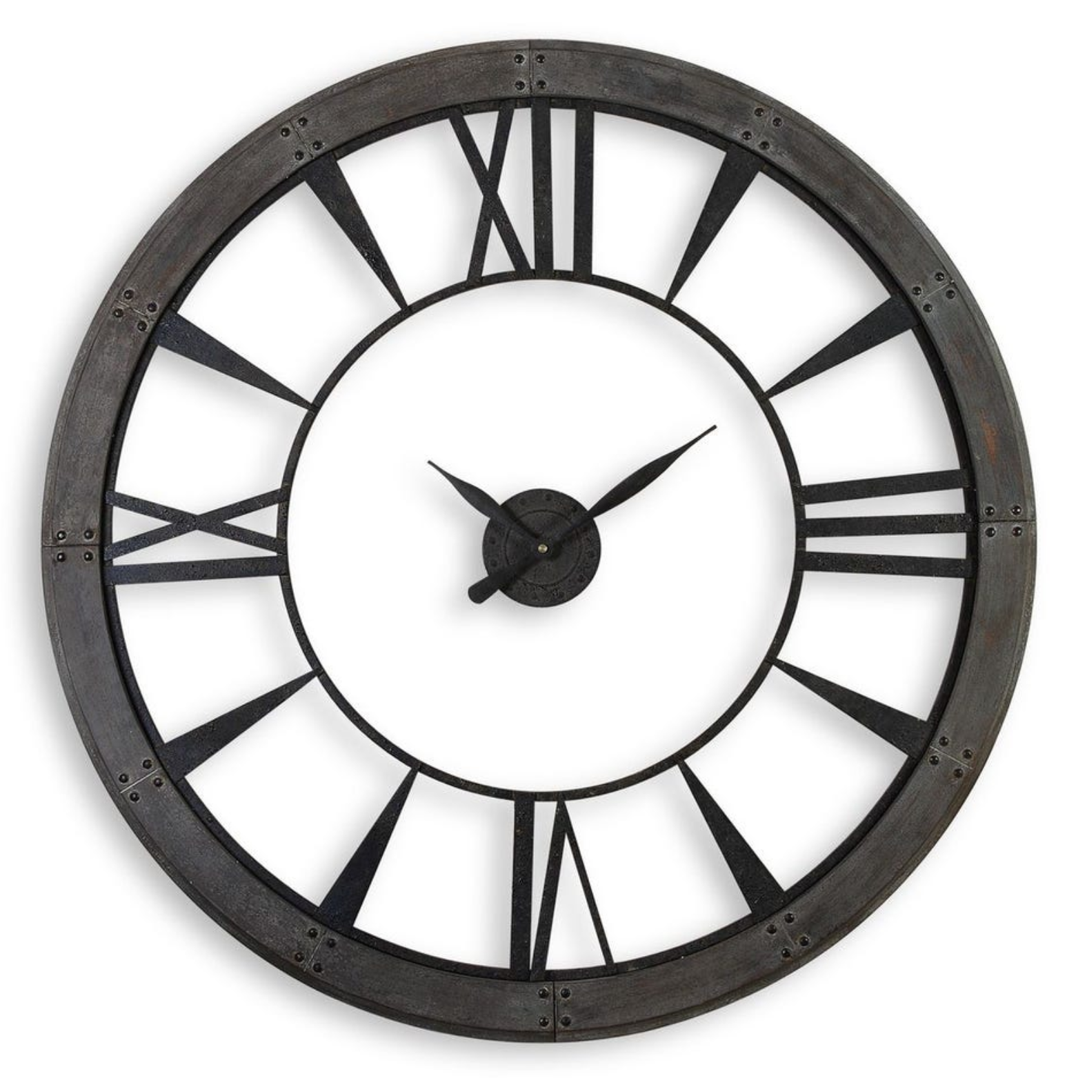 Oversized wall clock features a dark, rustic bronze finish accented with a rust gray frame. Quartz movement ensures accurate timekeeping. Requires one "AA" battery.