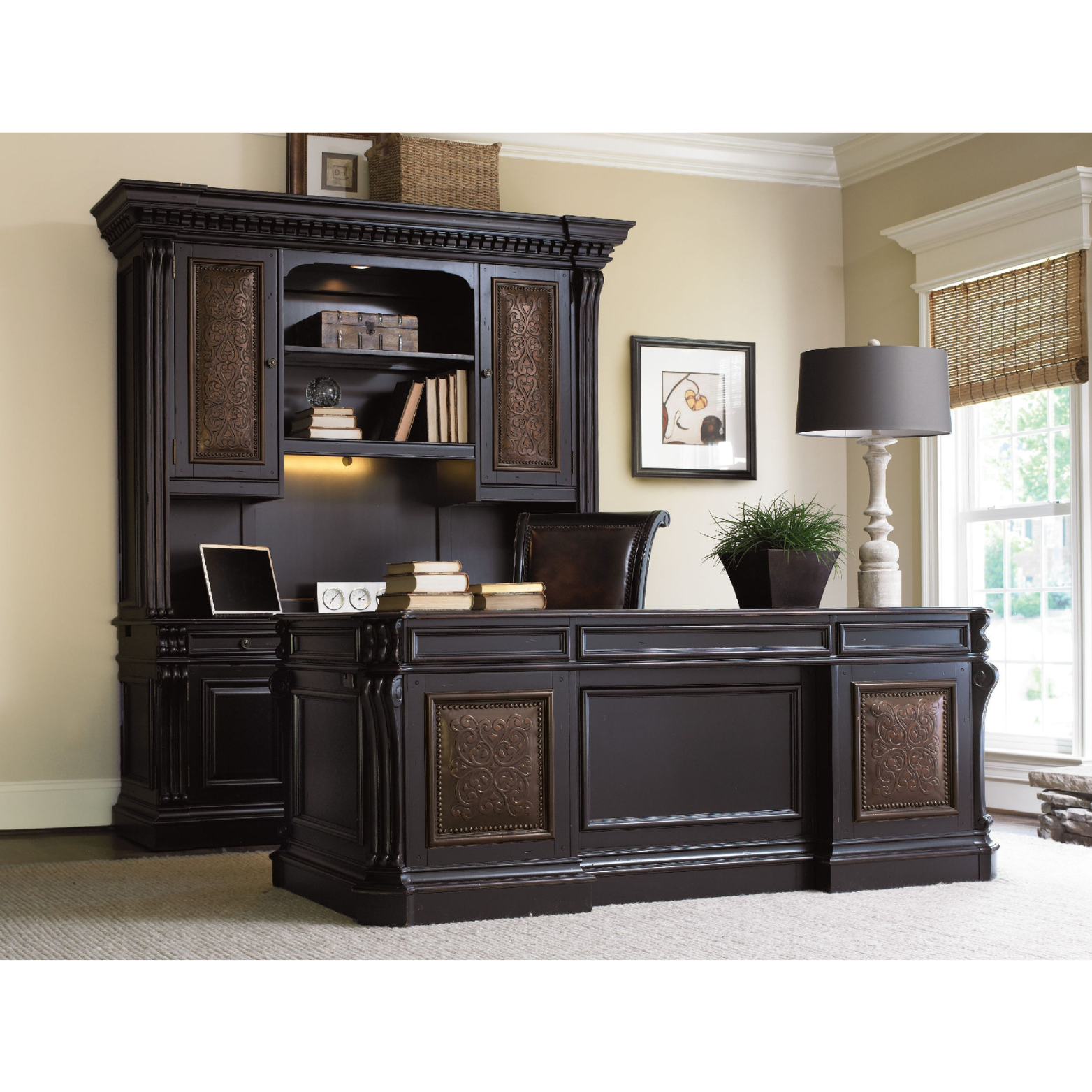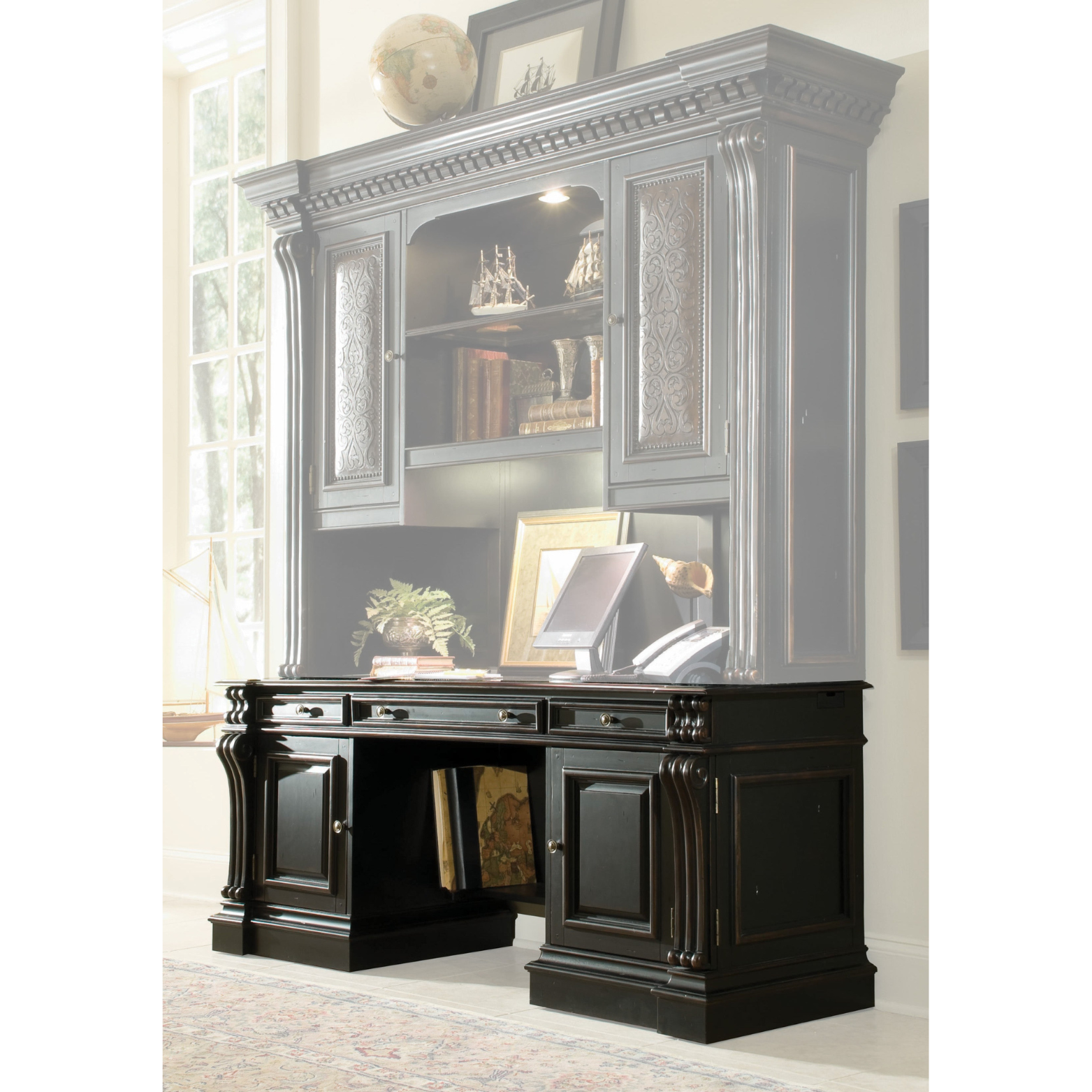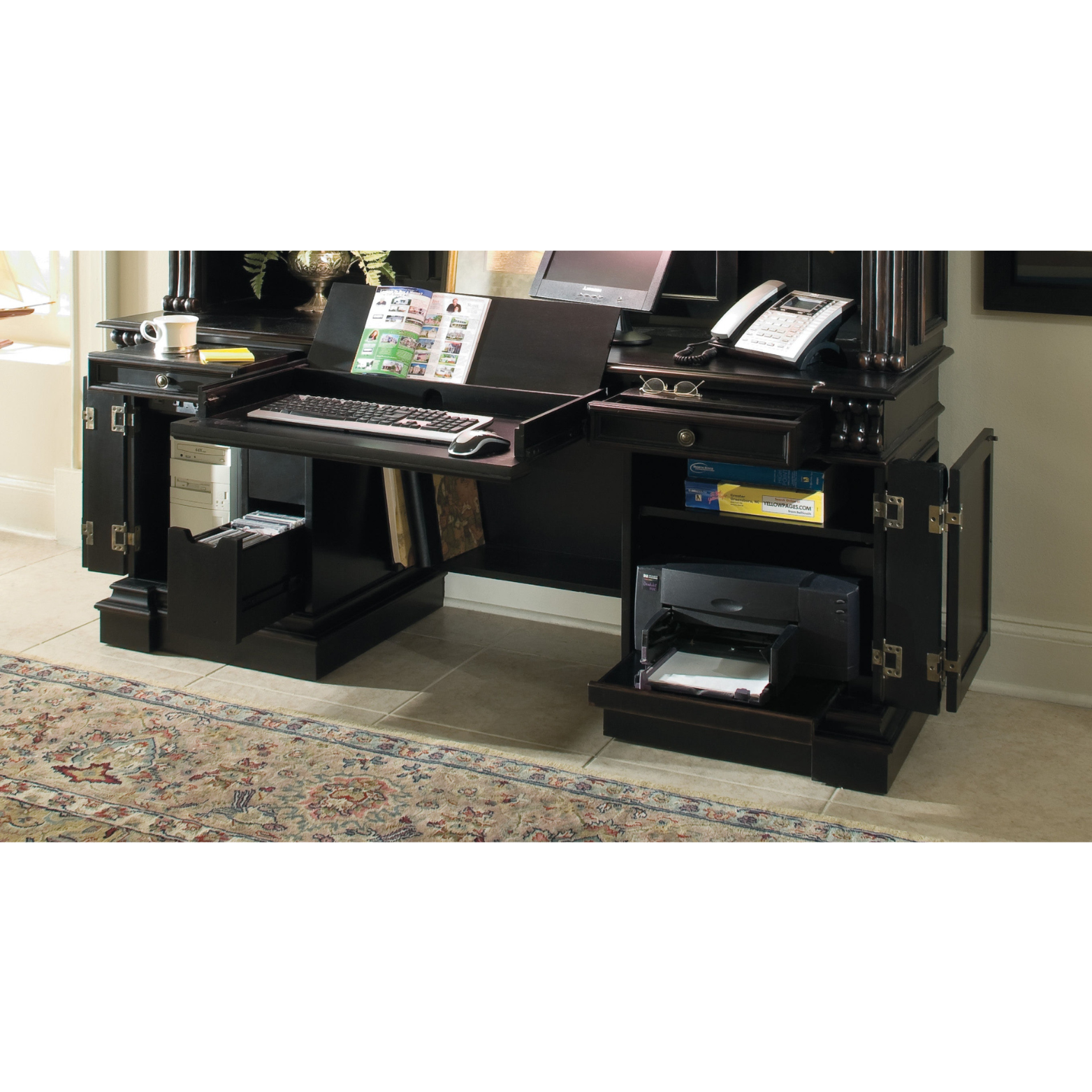 The Telluride Computer Credenza is a stylish work-from-home solution with a black paint finish accented by reddish brown rub-through and scroll-motif trim, exuding a rich masculine look of the English countryside. The piece has two drawers for CD/disc/thumbdrive storage and a power supply. The center drawer features a keyboard tray on steel ball bearing slides with a patented document-rest keyboard, along with removable partitions for storage. One utility drawer, one adjustable shelf and a utility drawer with a writing slide. Crafted of Cherry Veneers. Telluride's black paint finish with reddish brown rub-through, carved leather panels and nail head trim give this collection a rich masculine look.