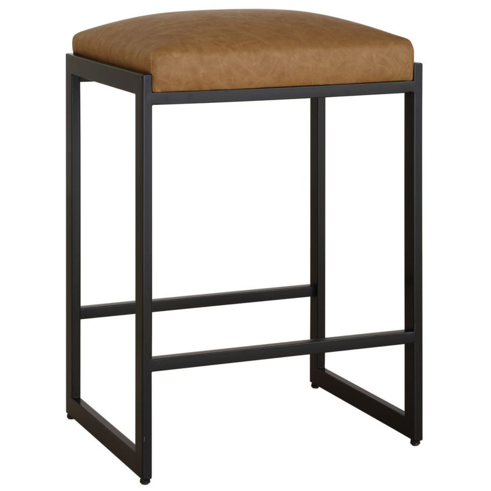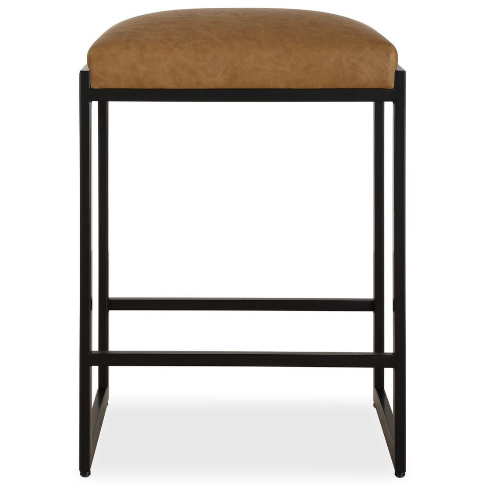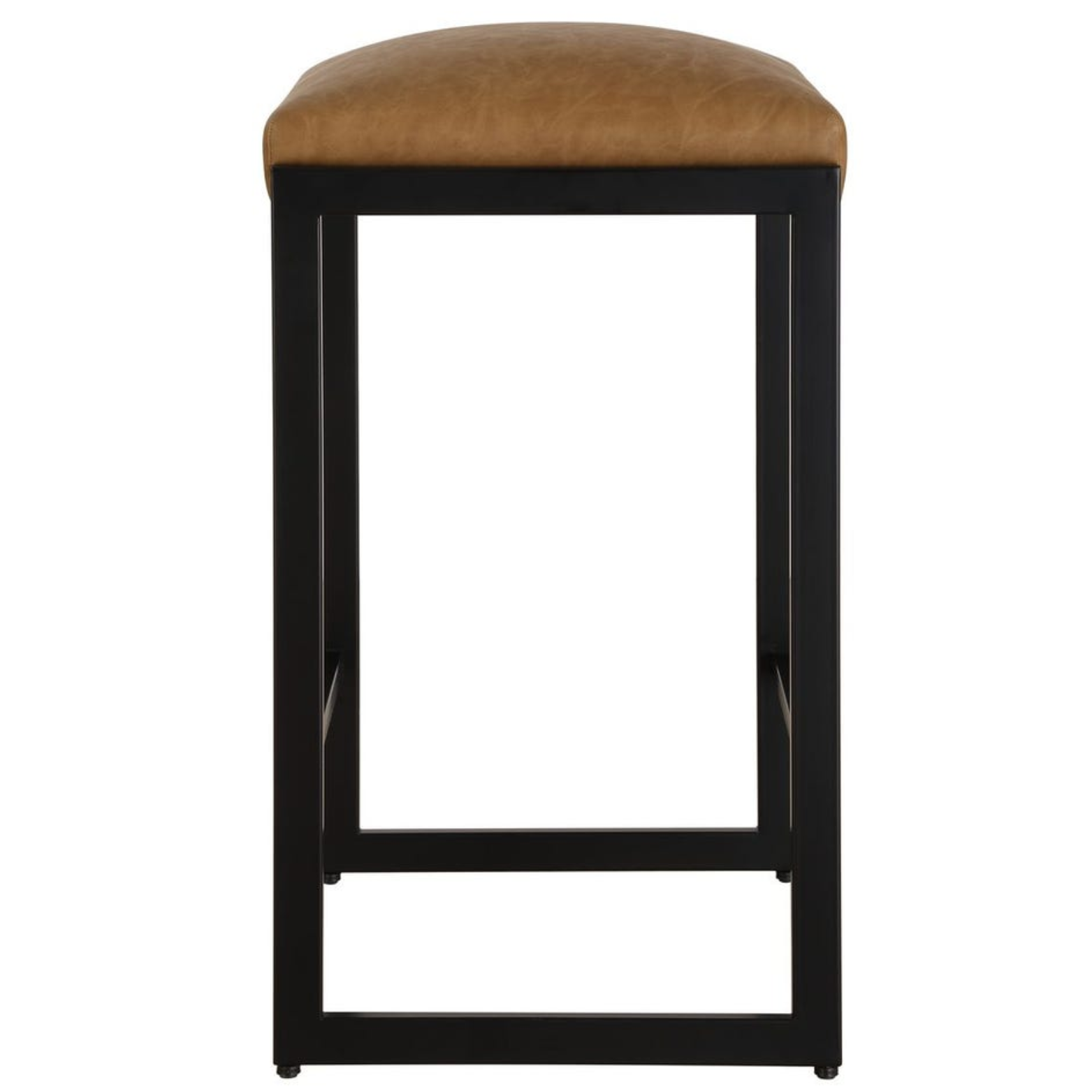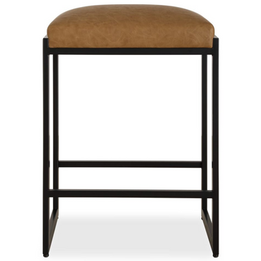 Clean contemporary lines are accented with subtle stylish details. The satin black finished iron is complemented with an inset cushion upholstered in a rich camel faux leather.