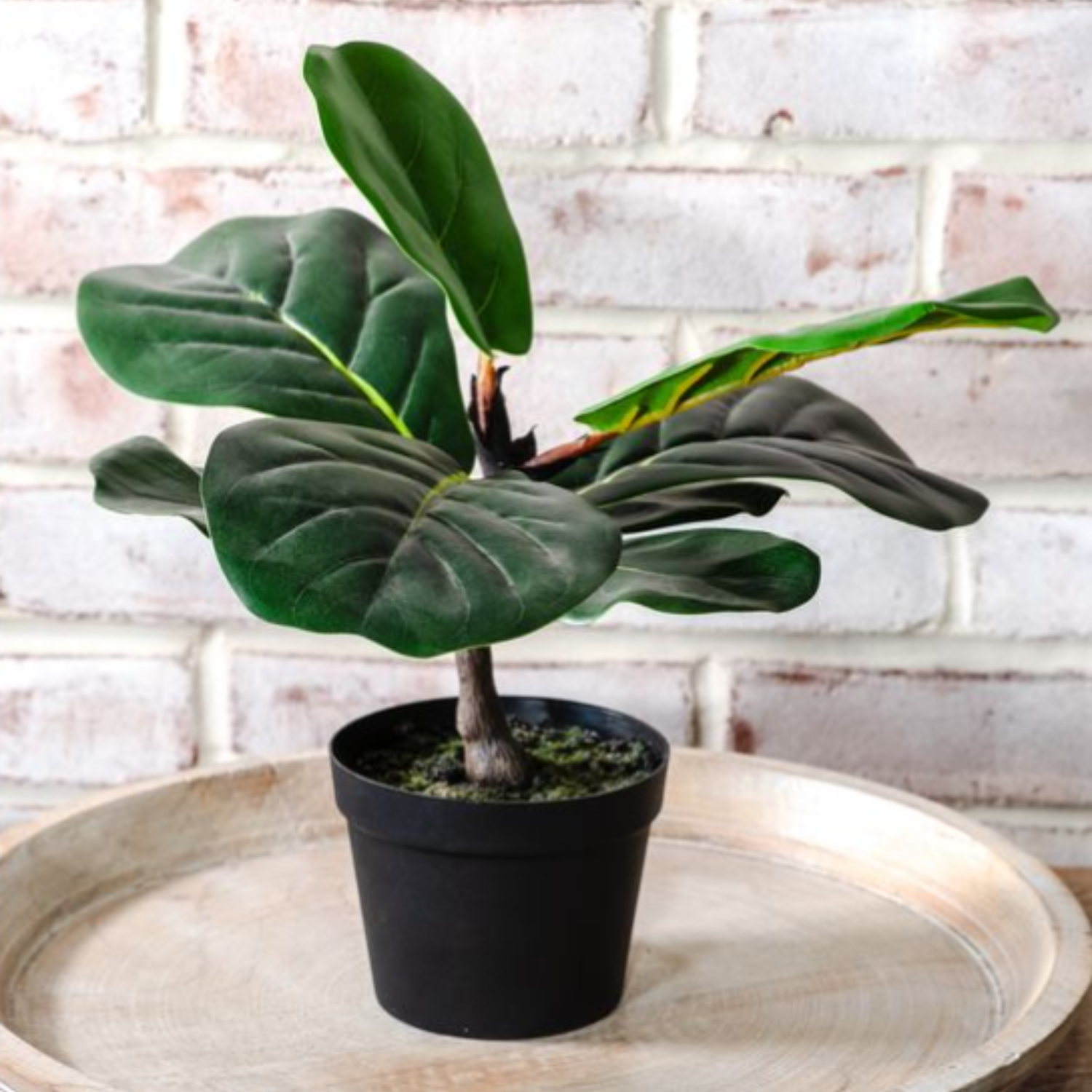 Realistic faux fiddle leaf tree standing 13.5" tall, perfect for adding greenery without maintenance. A stylish accent for shelves, desks, or tabletops.