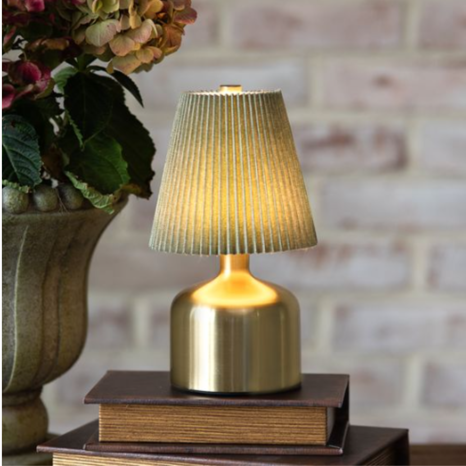 Rechargeable LED table lamp with a green and gold finish and a 7.75" height. A stylish cordless lighting accent perfect for desks, nightstands, or tabletops.