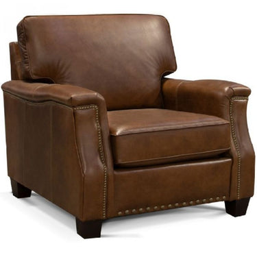 The Salem Leather Chair With Nailhead features high-quality leather and elegant nailhead detailing, adding both comfort and style to your living room.