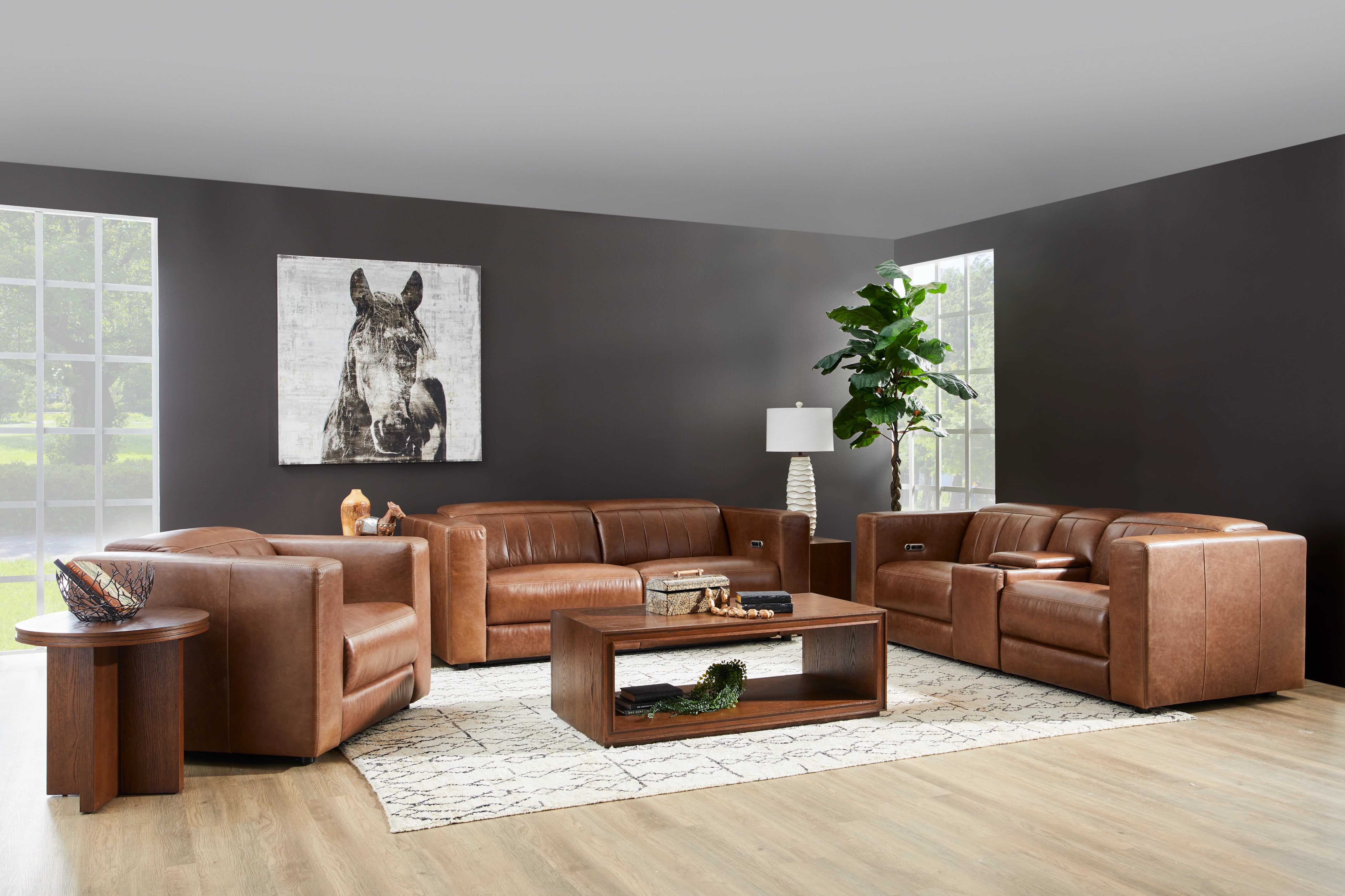Casually elegant and substantial in form, the Austin power reclining loveseat with power headrests and console defies expectations with customizable comfort and Zero Gravity technology. Wide track arms, spacious seat cushions, and integrated storage beckon relaxation, while alluring in-back channeling and a bold geometric profile add contemporary flair. Upholstered in sumptuous leather that develops a patina as it ages, the Austin loveseat is designed for those who appreciate the authentic character of materials.