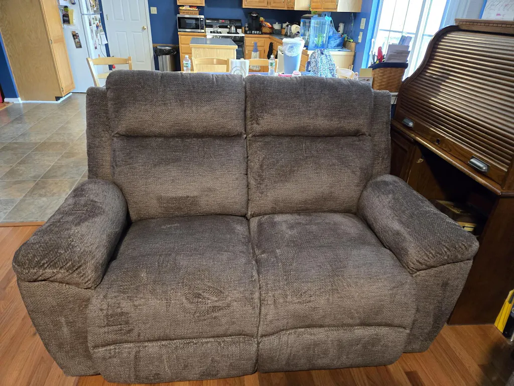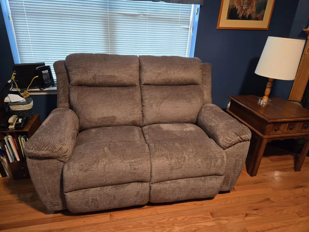 The Joel Reclining Loveseat In Brownstone offers ample seating with reclining features, perfect for relaxing with a loved one in your living room.