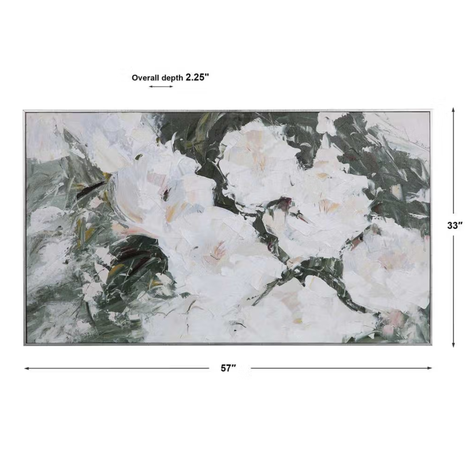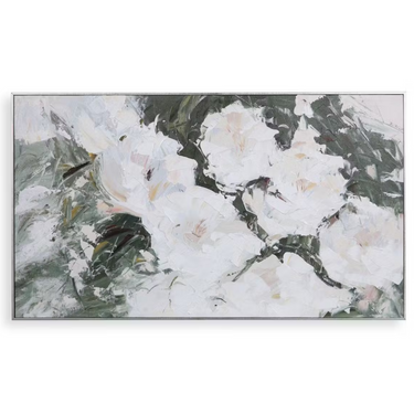 Hand painted on canvas, this floral artwork depicts a collection of the popular sweet southern flower. White and cream tones pop against a forest green background, all complemented by an antique silver leaf gallery frame. Due to the handcrafted nature of this artwork, each piece may have subtle differences.