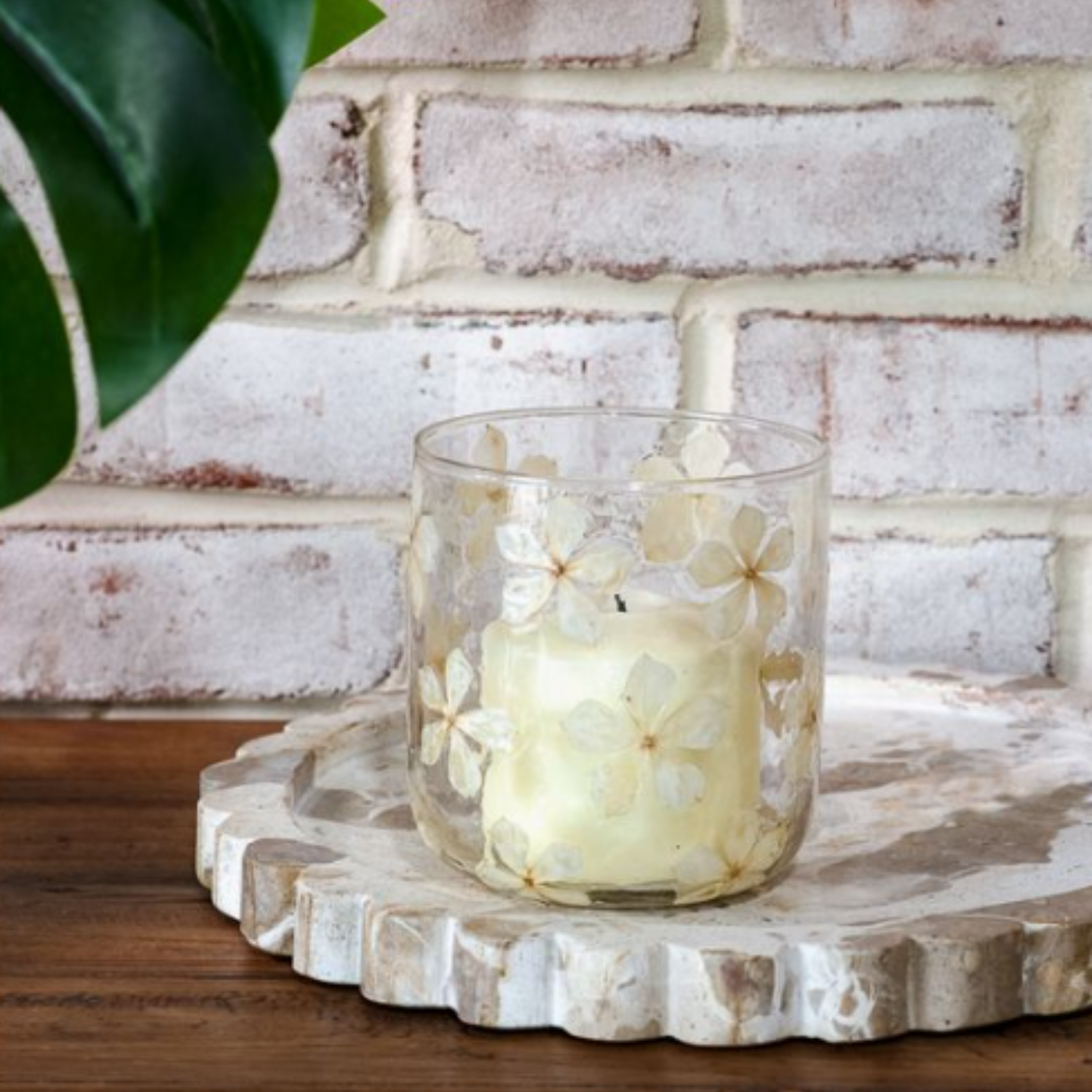 Decorative 4.3" candle jar filled with dried flowers, perfect for adding a natural accent to shelves, tables, or mantels.