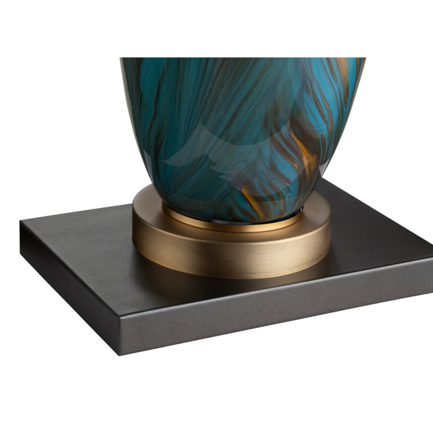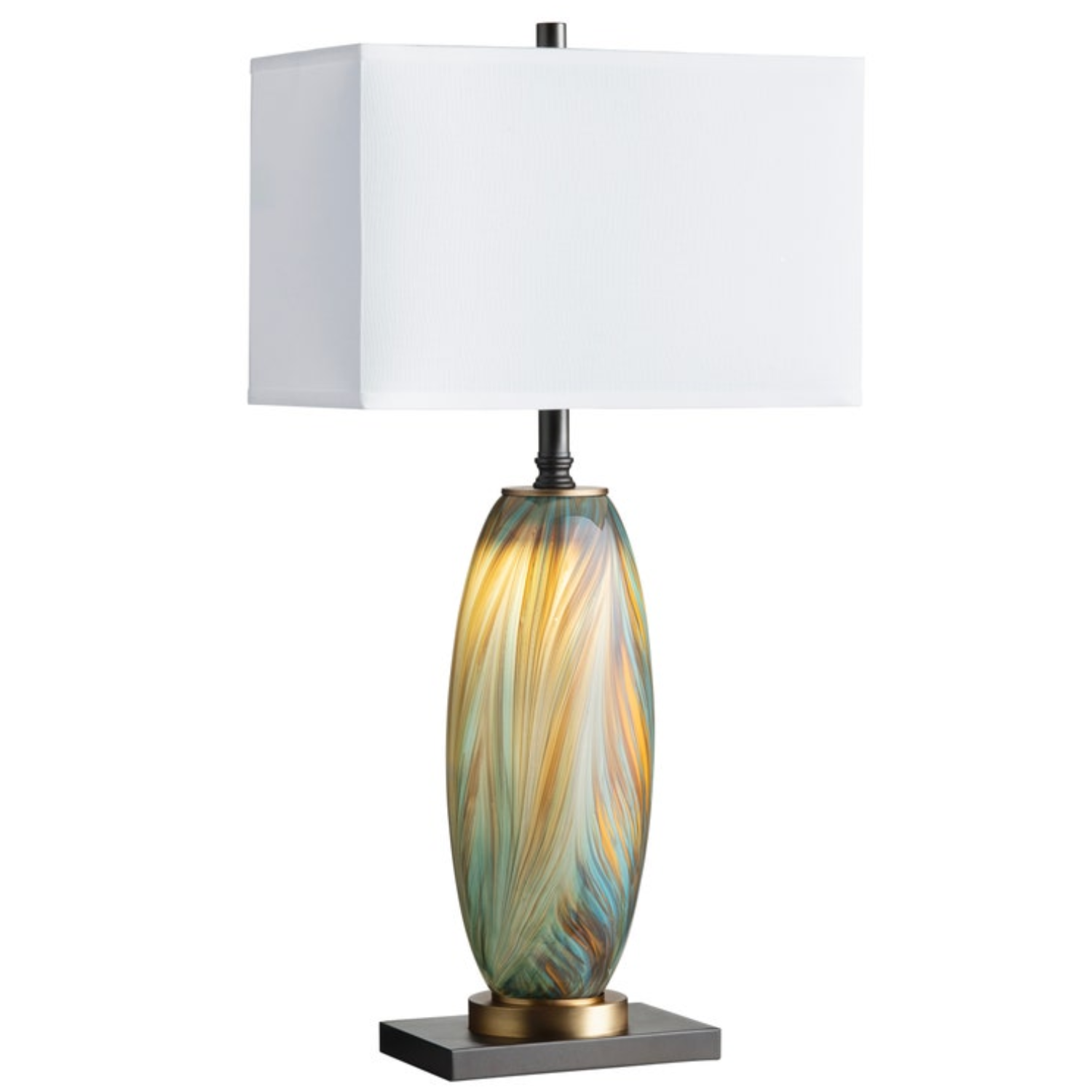 Blue art glass table lamp with a sculpted base and white shade for a modern accent.