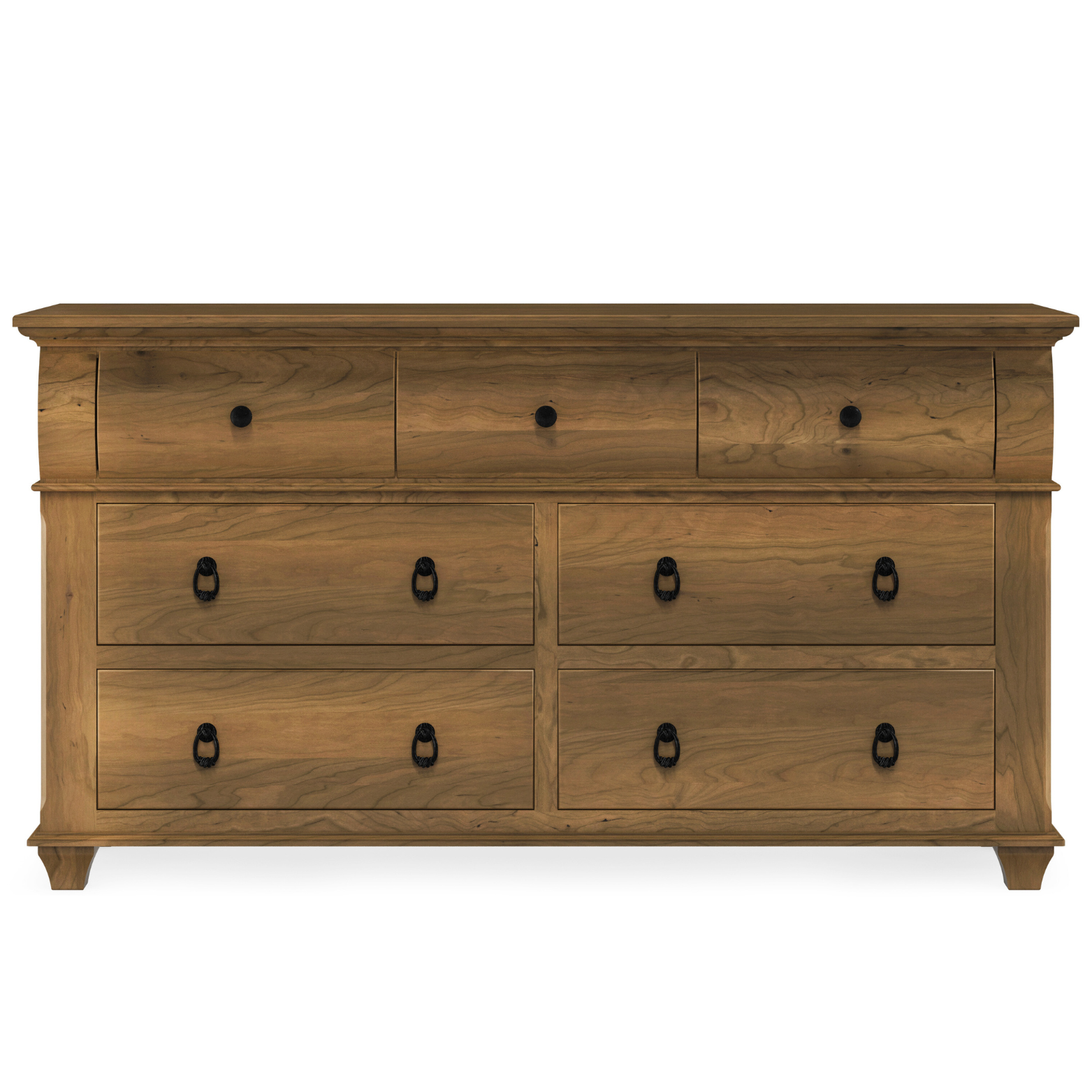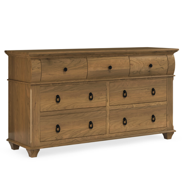 A lush rolling island known for its relaxed style of luxurious-simplicity, beauty and elegance inspires this collection’s look. The panel bed, based on early 1800s style, features generous, beautifully carved posts and a graceful fireplace mantel top. A unique, curved crown and large raised panels complete the design. The arched panel bed is based upon the arched entryway into the original Bartlett Mansion. The towering 72-inch headboard features a gracefully arched mantel, flanked by Roman posts and raised panels. Both bed designs and coordinating pieces are available in a variety of wood species and finishes.