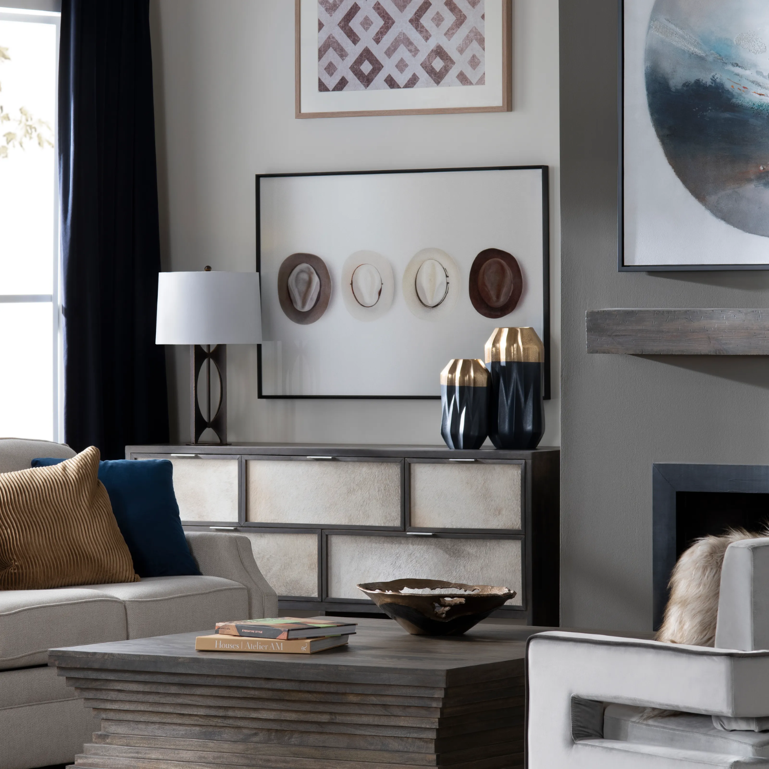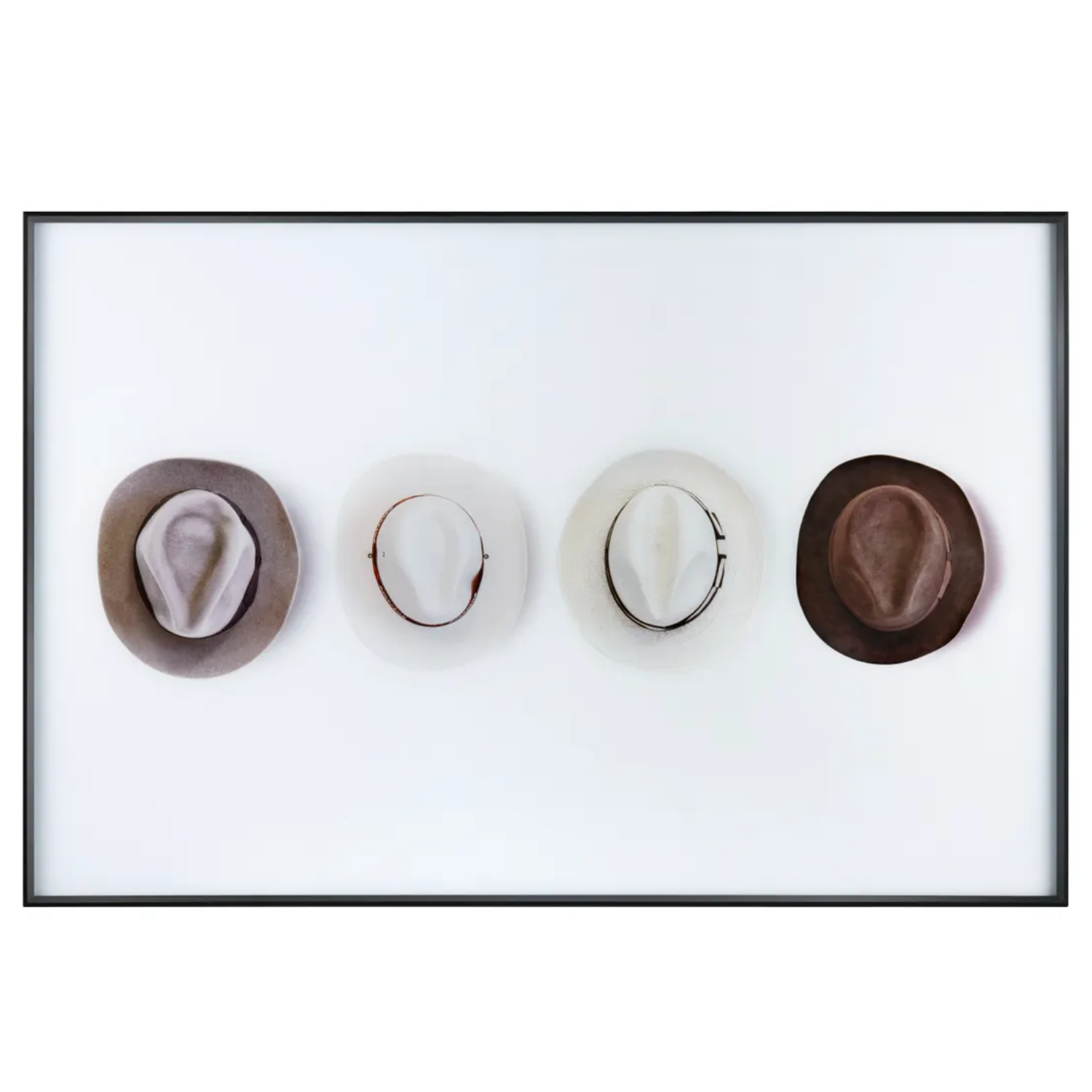 Introducing our striking "Billings" Print on Tempered Glass, a captivating piece of art that pays homage to the timeless style and rugged spirit of the Wild West. This print showcases a group of four Western hats, elegantly arranged in a line at the center, against a clean white background, creating a visually pleasing and balanced composition. The focal point of the artwork is the group of Western hats, carefully chosen for their distinctive shapes and intricate details. The hats, rendered in a natural color scheme of white, grey, and brown, exude a sense of authenticity and character. Each hat tells its own story, representing the spirit of the frontier and the adventures that lie beyond. Printed on tempered glass, this artwork boasts a sleek and modern presentation. The glass not only enhances the colors and details of the image but also adds a reflective quality, creating a captivating interplay between light and shadow. To complement the artwork and add a touch of sophistication, it is finished with a sleek black frame.