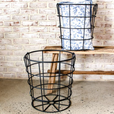 Black iron pillow baskets with an open metal design, sold as a set of two. Perfect for storing throw pillows, blankets, or adding stylish organization to living spaces.