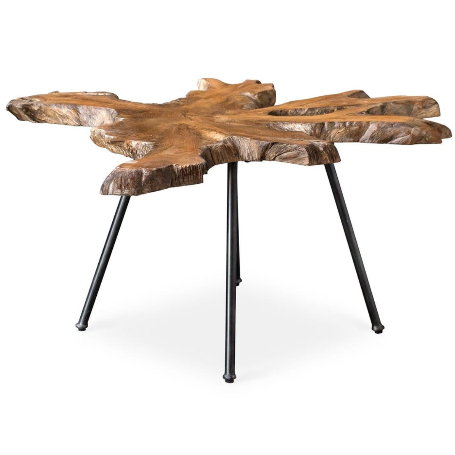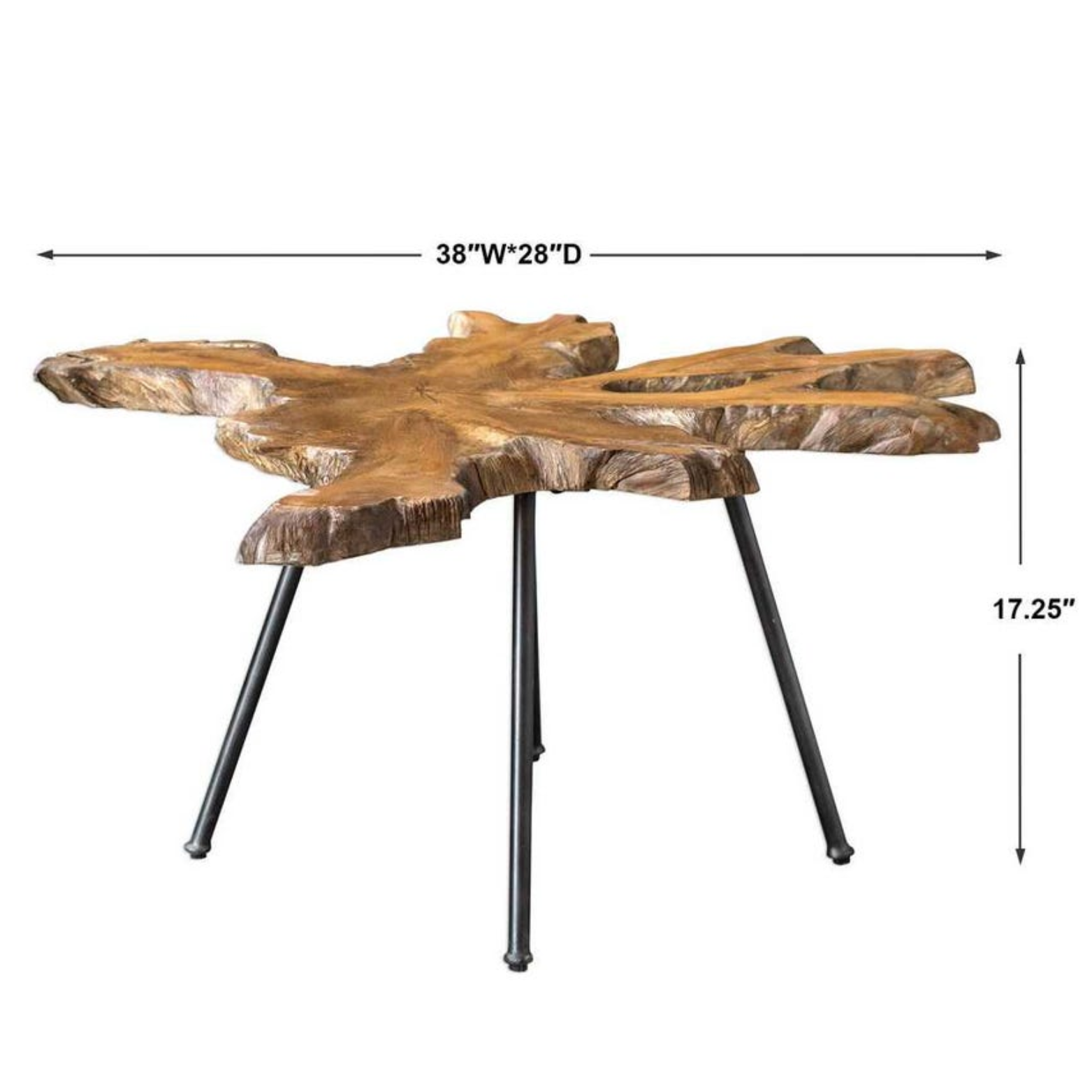 Featuring solid wood construction, this coffee table is topped with a deeply grained cross section of natural teak wood with light honey glazing, paired with aged black finished iron legs. Sizes and grain pattern may vary due to the authentic nature of the design.