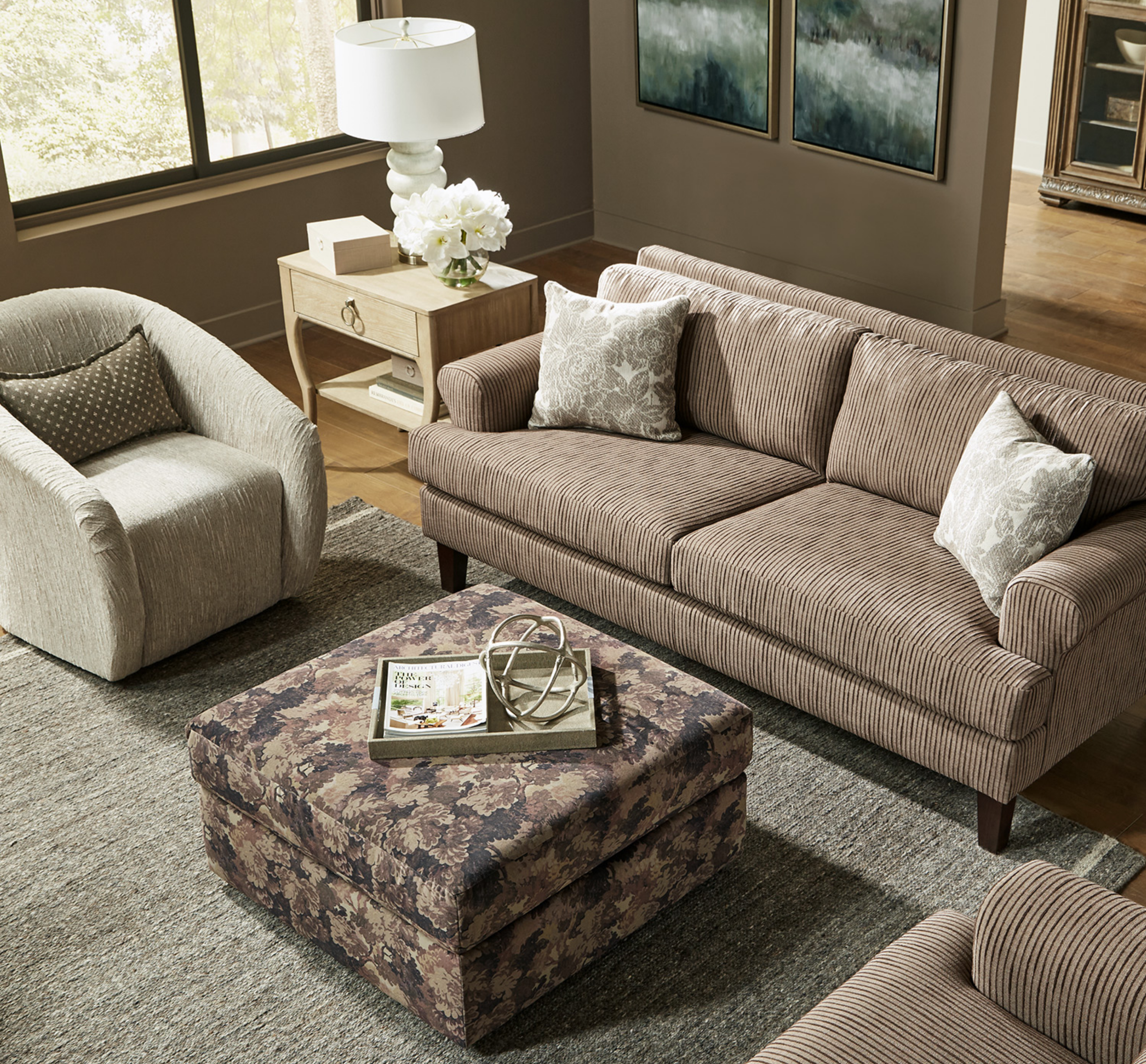 From morning coffee to late-night conversations, Lumira is the kind of piece that quietly elevates your everyday rituals. Sink into its generous seating, tailored to feel both plush and poised. USA craftsmanship shines with quality and customization. Choose from three curated wood finish options to ground the look in your personal style—and over 700 fabrics to make it unmistakably yours.