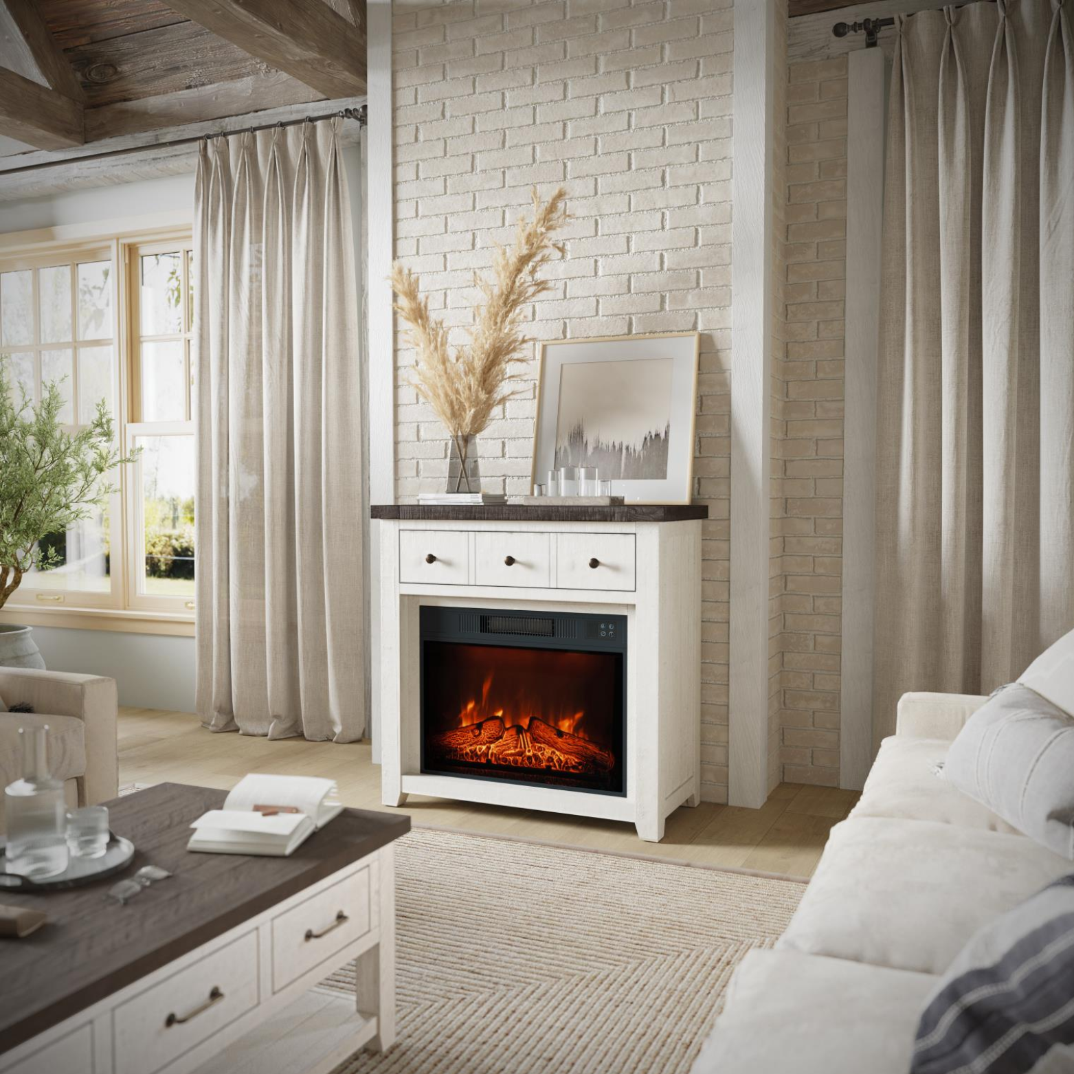 Introducing the Hearthside Collection, our range of space-saving 32" fireplaces, expertly assembled and styled to fit any décor. Whether you’re looking to complement our Occasional and Dining room collections or make a statement with a stand-alone piece, Hearthside fireplaces offer unmatched versatility. Each unit arrives ready to use, with a pre-installed log set, large drawer, and intuitive remote and panel controls. Enjoy customizable flame and heat settings and essential safety features for a warm, inviting, and secure environment.