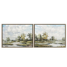 Thoughtfully designed by Crestview Collection, the set of two "Moore" paintings is an ideal choice for those looking to bring the outdoors inside. This captivating 31.5x23.6" pair features a hillside landscape filled with vibrant green trees that sway gently atop a grassy knoll. The artwork beautifully depicts a freshwater creek that meanders through the landscape against a backdrop of blue sky and billowing clouds. The careful attention to detail in the foliage and the play of light across the water adds depth and richness to each canvas, immersing viewers in the beauty of nature. Each painting is beautifully encased in a natural brown wood frame that emphasizes the organic elements of the scene. Carefully mount the set to any desired wall space with the included D-ring brackets for the ultimate cottage-inspired aesthetic.