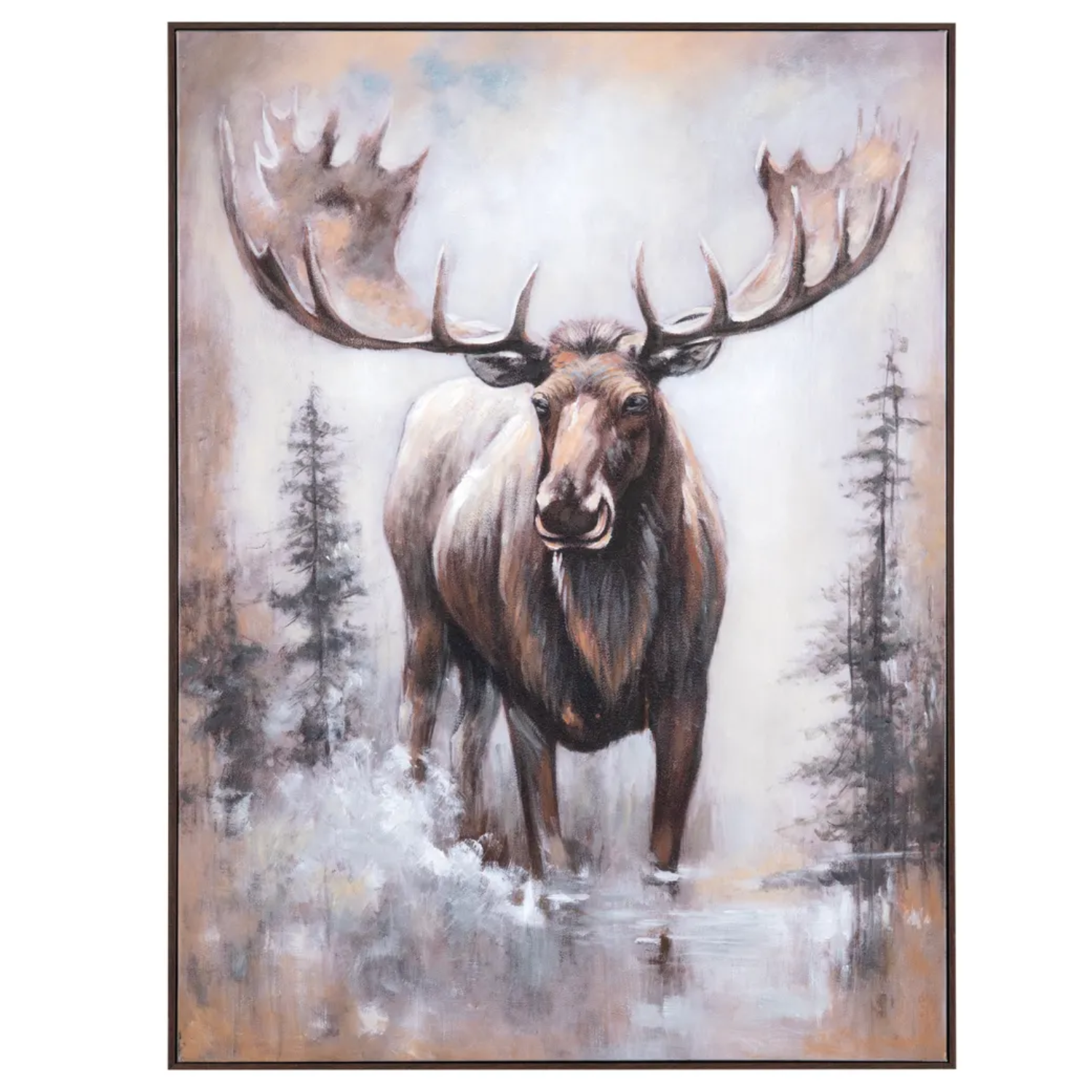 Presented by Crestview Collection, the "Mooz" wall art painting brings the majesty of the great outdoors into your home. Measuring 30" x 40", this rugged piece features a detailed portrait of a stoic moose standing proudly amidst the serene backdrop of nature. The soft brown hues and weathered natural wood frame evoke a deep sense of wonder and appreciation for the wilderness. Whether displayed in a living room, cabin, or office, this captivating artwork serves as a reminder of the beauty and tranquility found in nature. For proper wall display, use the two included D-ring brackets for quick and easy installation.