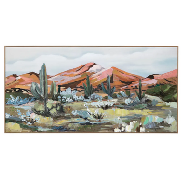 The "Tucson" wall decor by Crestview Collection transports viewers to a sun-soaked desert vista, where the bold, warm hues of the red clay mountains contrast beautifully with the cooler tones of the sky. Surrounding the 30x60" canvas is a natural brown wood frame that enhances its earthy appeal and complements the green desert foliage and cacti that punctuate the landscape. Whether displayed in a living room, office, or hallway, it brings a sense of calm and connection to the natural world. Carefully mount the piece to your desired wall space with the two included, D-ring brackets.
