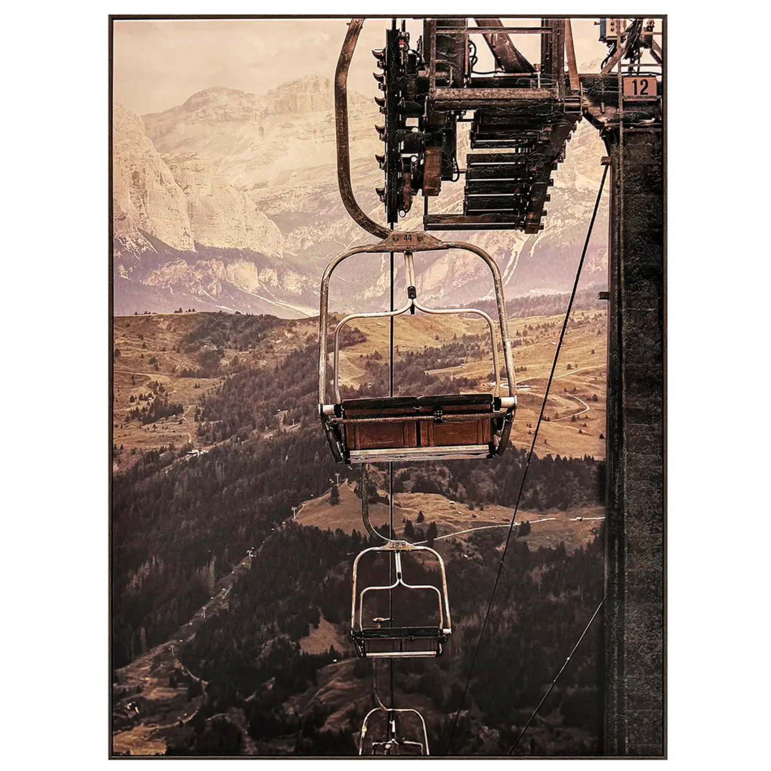 Mountain ski lift wall art featuring a scenic alpine landscape and vintage chairlift view.