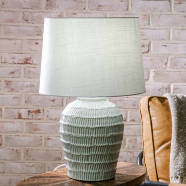 White ceramic lamp featuring a subtle thin stripe texture for a clean, modern look. A versatile lighting accent perfect for nightstands, desks, or side tables.